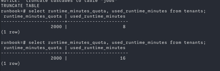 In order to not let people take advantage of the platform, I decided to put some Runtime quotas in place, depending on the pricing plan the user (or their tenant) is on. Quotas are expressed in minutes, similarly to what other CI/CD runners are doing (e.g. Github’s 2000 minutes/month). Tracking these minutes is easy, the hard decision comes what to do when the minutes run out. Say a user has 5 minutes left of their quota, and they start a workflow that happens to run for 10 minutes. There are two possible outcomes: